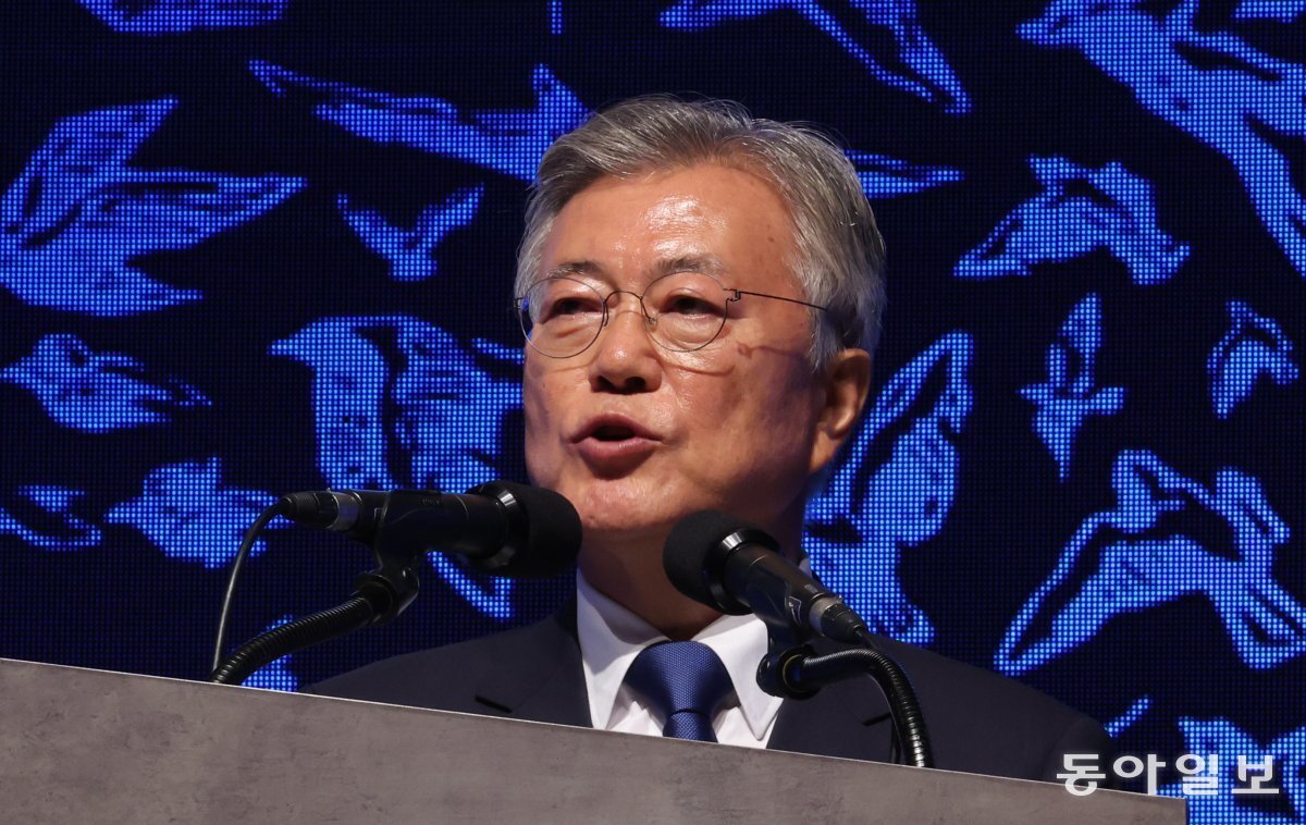 크게보기문재인 전 대통령이 19일 오후 서울 영등포구 63빌딩에서 열린 9·19 평양공동선언 5주년 기념식에서 인사말을 하고 있다. 사진공동취재단